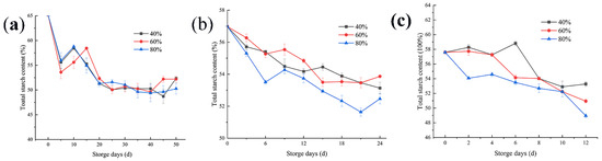 Changes in the total starch content of rice under three different relative humidity conditions at storage temperatures of 20 (a), 30 (b), and 35 °C (c).