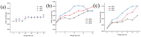 Peak viscosity is an important index to measure the rice cooking quality and food quality, and its changes in storage can provide a certain theoretical basis for determining the degree of deterioration of rice quality during the storage process, with great significance for monitoring the rice quality during storage. As shown in Figure 4a, when rice was stored at 20 °C, the decrease in the microbial activity and enzyme activities of rice itself caused the peak viscosity of samples to change little, with only a slight upward trend. When stored at 30 °C, as shown in Figure 4b, the microorganisms resumed their activities and enzyme activity increased, increasing the peak viscosity with storage time. In the later storage period, when the environmental humidity is 80%, the peak viscosity decreases, which is equivalent to the environmental humidity of 40%, which may be affected by enzyme activity. When rice is stored at 35 °C, the peak viscosity increases more obviously with the change of humidity.