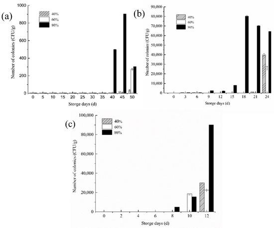 It can be observed in Figure 5 that the relative humidity of 80% was the closest to the optimal growth humidity of mold [18], so the rice microorganisms stored under this condition were the most active and had the greatest colonies. Similarly, the samples in the high-humidity environment showed a trend of increasing colony numbers first and then decreasing at the advanced stage of cultivation. This happened because there is a competitive relationship in the growth process of microorganisms. In the early stage, when the nutrients are rich, the temperature and humidity reach the optimal conditions and the microorganisms begin to multiply rapidly. After a period of time, the quantity reaches saturation [38]. At this time, the number of nutrients available for molds is greatly reduced; that is, there are few nutrients but many microorganisms, which causes some molds to continue to reproduce or even not to survive, so the number of mold colonies appears to decrease.
