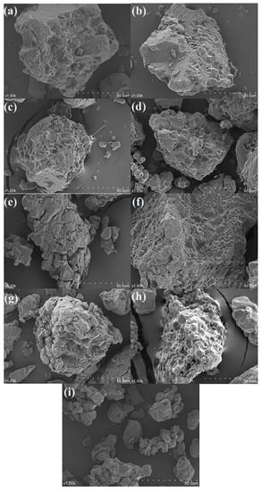 The main nutrients in rice are starch, protein, and fat in order from high to low. The content of starch in rice is up to approximately 75%. Taking rice stored at 20 °C and 80% relative humidity as an example, Figure 6a–I represents the micro-morphological structure of rice at different periods. It can be seen that with the increase in storage time and microbial activity, the starch granules gradually peeled off to form a single cube-shaped small granule. The fresh rice powder showed different sizes under the scanning electron microscope, and their surface was smooth and flat. The rice particles at this time had a tight combination of starch, proteins, and lipids. Encapsulations of starch, proteins, and the proteins are embedded as small molecular substances between the starch granules [10].