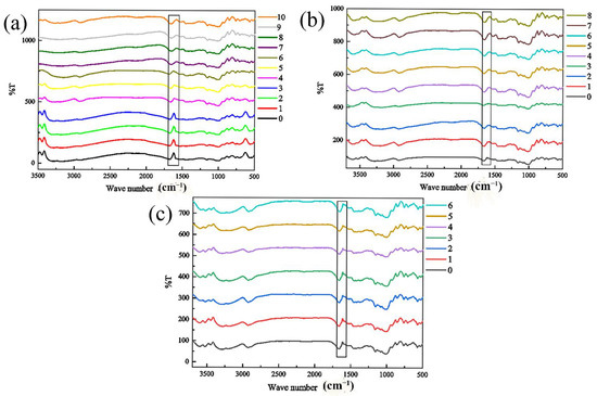 The change in the infrared spectrum of rice under ambient humidity of 80% different storage temperatures (a) 20 °C, (b) 30 °C, and (c) 35 °C.