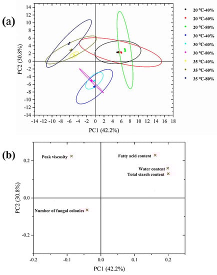 Principal component analysis was performed on the important factors affecting the mildew of rice samples. The first two principal components (PCs) accounted for 73% of the variation (Figure 8a,b). PC 1 and PC 2 accounted for 42.2% and 30.8% of the total variance, respectively. Rice samples were separated into nine clusters according to the storage temperature and humidity. As the storage proceeded, samples were spread on the positive side of PC 1 and the positive side of PC 2. The mildew index in rice samples was correlated with temperature and humidity during storage. The storage environment at 20 °C is closely related to fatty acid content, water content, and total starch content, the storage environment at 30 °C is highly related to the number of mold colonies, and the storage environment at 35 °C is significantly related to peak viscosity.