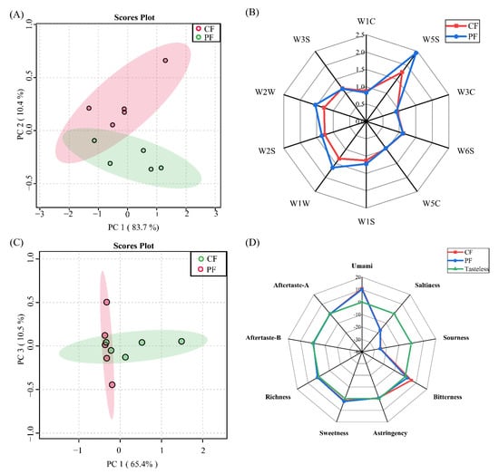 Aroma and taste profiles in concentrate-fed (CF) and pasture-fed (PF) groups (n = 5). Principal component analysis score plots and radar charts of the E-nose response values (A,B) and the E-tongue taste values (C,D).