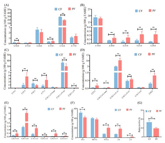 Comparison of fatty acid composition in concentrate-fed (CF) and pasture-fed (PF) groups (n = 8). (A–E) Concentrations of the fatty acids detected. (F) Contents of SFA, MUFA, PUFA, n-6 and n-3 PUFA in lamb. (G) The ratio of n-6 to n-3 PUFA. SFA, saturated fatty acids, MUFA, monounsaturated fatty acids, PUFA, polyunsaturated fatty acids. * p < 0.05, ** p < 0.01.