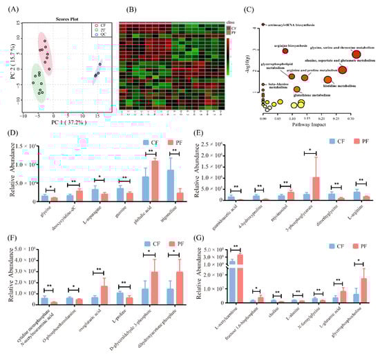 Hydrophilic metabolites in concentrate-fed (CF) and pasture-fed (PF) groups (n = 8). (A) Score plots of principal component analysis of the identified metabolites. (B) Heatmap and (D–G) bar graphs present the significant metabolites between the CF and PF groups. The significantly increased and decreased levels of metabolites were represented as the red and green cells, respectively, in the heatmap. (C) Pathway analysis of significantly different metabolites by means of MetaboAnalyst 5.0 online. QC, quality control samples. * p < 0.05, ** p < 0.01.