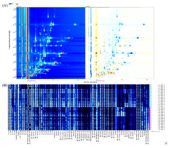 Volatile compound profiles in concentrate-fed (CF) and pasture-fed (PF) groups (n = 5). (A) Two-dimensional topographic plots for lamb with different feeding systems. The darker color indicates greater intensity (red represents to high levels of volatiles and white represents to low levels). (B) Gallery plot of the selected signal intensities collected with different feeding systems.
