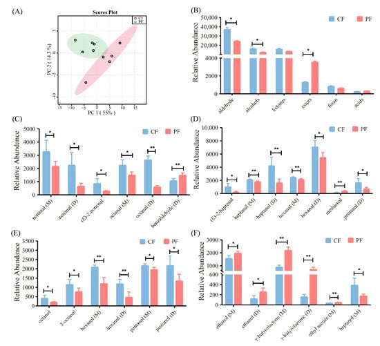 Comparison of the identified volatile compounds in concentrate-fed (CF) and pasture-fed (PF) groups (n = 5). (A) Principal component analysis score plots of volatile compounds in lamb with different feeding systems. (B) Comparison of volatile categories identified in the CF and PF groups. (C–F) Bar graphs present the significant volatile compounds between the CF and PF groups. M, monomer; D, dimer. * p < 0.05, ** p < 0.01.