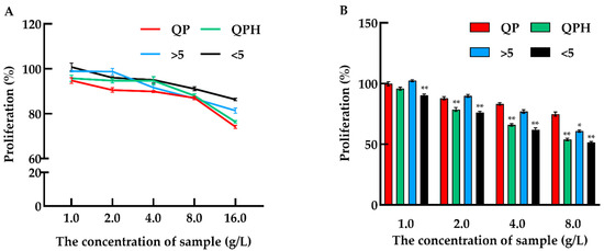 Cytotoxic effect and anti-proliferative activity of different fractions from quinoa protein on Caco-2 cells. (A) Dose dependent effect of different quinoa protein fractions on Caco-2 cells after 24 h treatment; (B) the cell proliferation rate of Caco-2 cells under gradient concentration of quinoa protein fractions after 72 h treatment. QP: quinoa protein concentrate, QPH: quinoa protein hydrolysate, >5 kDa: fractions MW > 5 kDa, <5 kDa: fractions MW < 5 kDa. * p < 0.05 and ** p < 0.01 indicate significant and highly significant differences between the QP and other treatments, respectively.