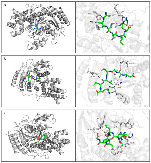 Best binding mode between HDAC1 and studied peptides retrieved from focused molecular docking. (A) FHPFPR, (B) NWFPLPR, (C) HYNPYFPGGA. The general overview was shown in the left panel. The interaction (block dotted lines) between the residues of HDAC1 (grey sticks) and peptides (green sticks) was zoomed in the right panel.