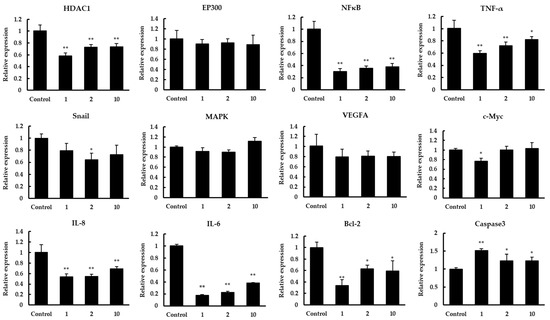 The effect of quinoa peptides 1, 2, 10 on the mRNA transcript levels of HDAC1, EP300, NFκB, TNF-α, Snail, MAPK, VEGFA, c-Myc, IL-8, IL-6, Bcl-2, and caspase3. The mRNA expression results are displayed as the fold increase of mRNA expression normalized to GAPDH and shown in mean ± SD. * p < 0.05 and ** p < 0.01 versus control group.