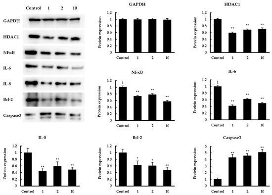 Western blot analysis. The effect of quinoa peptides 1, 2, 10 in protein levels of GAPDH, HDAC1, NFκB, IL-6, IL-8, Bcl-2, caspase3. GAPDH was set as the loading control. Expression was normalized to GAPDH expression and shown in mean ± SD. * p < 0.05 and ** p < 0.01 versus control group.