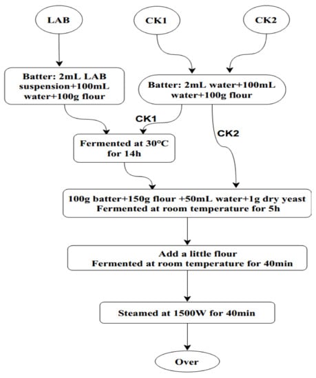The production process is shown in Figure 1. CSB were produced from a mixture of 150 g of flour, 100 g of sourdough, 1 g of instant dry yeast (Angel Yeast(Yili)Co.,Ltd., Yili, Xinjiang, China) and 50 mL of water. After stirring, the dough was incubated at room temperature (approximately 22 °C) for 5 h. The dough was smoothed with a small amount of flour, and then divided into pieces of 50–55 g. The dough pieces were rolled into balls, incubated in a steamer at room temperature for 30–40 min and then steamed at 100 °C for 30–35 min. The steamed bread was placed in a clean environment for 2 h and aired to room temperature. The steamed bread samples of the experimental group and the two control groups were sliced, placed into a sterilized and dry plate, and part of it was placed in a clean edible bag. Three parallel procedures were set in each group, and the time was recorded. Photos were taken every day to observe the gap between the experimental group and the control group.