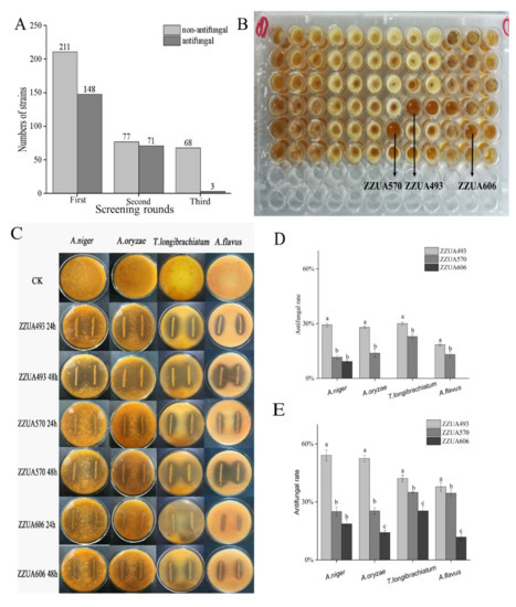 Detection of antifungal ability by 96-well microtiter plate and dual-culture overlay assay method. The strains with antifungal ability against A. niger screened out in three rounds by 96-well microtiter plate method (A); 96-well plate method was used to detect the antibacterial activity of 71 LAB strains against A. niger (B); The antifungal activity of ZZUA493, ZZUA570 and ZZUA606 against 4 kinds of fungi (A. niger, A. oryzae, T. longibrachiatum and A. flavus), tested by dual-culture overlay assay method (C); Antifungal rate of ZZUA493, ZZUA570 and ZZUA606 against 4 kinds of fungi after 24 h incubation (D); Antifungal rate of ZZUA493, ZZUA570 and ZZUA606 against 4 kinds of fungi after 48 h incubation (E). Values with different superscript lowercase letters show significant differences among treatments of ZZUA493, ZZUA570 and ZZUA606 (p < 0.05). CK, no LAB control; A. niger, Aspergillus niger; A. oryzae, Aspergillus oryzae; T. longibrachiatum, Trichoderma longibrachiatum; A. flavus, Aspergillus flavus.