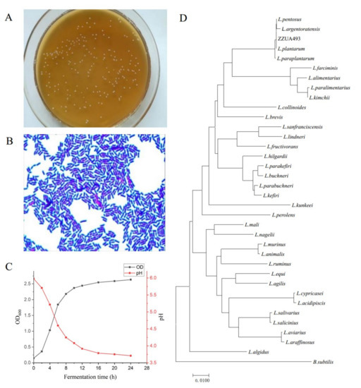 Identification of ZZUA493 strain. Colony morphology (A); gram staining (B); growth and pH change curve of ZZUA493 (C); phylogenetic tree obtained from 16Sr RNA gene sequence analysis, giving the genus of ZZUA493; the tree was generated by the neighbor-joining method and the bar shows 1% sequence divergence (D).