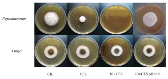 In this study, it was found that ZZUA493 had obvious inhibitory regions against A. niger, A. oryzae, T. longibrachiatum and A. flavus using the double-layer plate scribing method (Figure 2C), which indicated that ZZUA493 had broad-spectrum antibacterial activity. The fungal spoilage of grain is often caused by Fusarium spp. and results in serious risks to food safety and human health [30]. The high toxicity and carcinogenicity of Fusarium spp. mean that inhibiting the growth is critical for effective grain preservation in storage. The addition of the CFS of ZZUA493 showed clear inhibition against F. graminearum but low inhibition against A. niger (Figure 4), which meant that F. graminearum was more sensitive to the CFS. However, the antifungal activity of ZZUA493 against A. niger in the previous results was the opposite, which may have been due to the low content of antifungal substances in the 10 × CFS. The metabolites produced by LAB in original and neutralized CFS showed various degrees of antifungal activity. A 10-fold-concentrated culture filtrate of L. plantarum completely inhibited Eurotium repens, Eurotium rubrum and Penicillium corylophilum [31]. In this study, F. graminearum did not grow at all on the plate containing 10 × CFS. When the pH of the 10 × CFS was adjusted to 6.0, the CFS showed no antifungal activity compared with the CFS that was not neutralized. In a previous report, the antifungal activity of the CFS, after adjustment to pH 7.0, was no better than blank growth medium [32], which is consistent with our results. Therefore, it appeared that either organic acids themselves inhibited the growth of fungi, or the acidic environment produced by the organic acids may be conducive to the antifungal activity of other antifungal substances.