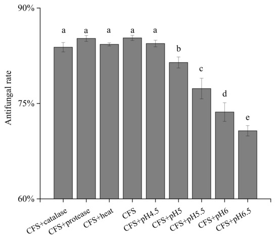 The antifungal rate of CFS after different treatments in 96-well microtiter plate method. Values with different superscript lowercase letters show significant differences among treatments (p < 0.05). CFS, cell-free supernatant.