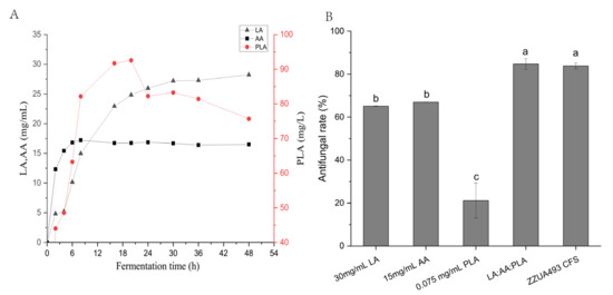 The organic acid production curve of ZZUA493 (A). The antifungal rate of LA, AA, PLA and their mixtures and CFS (B). Values with different superscript lowercase letters show significant differences among treatments (p < 0.05). LA, lactic acid; AA, acetic acid; PLA, phenyllactic acids. LA: AA: PLA, the mixtures of 30 mg/mL LA, 15 mg/mL AA and 0.075 mg/mL PLA; CFS, cell-free supernatant.