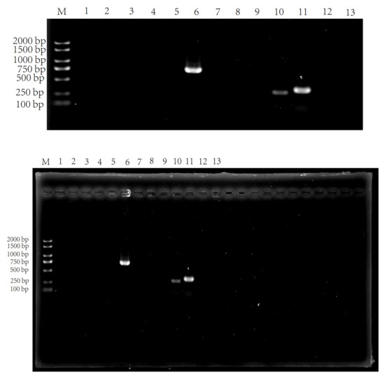 Agarose gel (1.5%) electrophoresis of the PCR products of bacteriocin-related genes. Lane numbers represent bacteriocin-related genes as follows: M. DL2000 plus DNA Marker; 1. pln423; 2. plnQ; 3. plnN; 4. PlnNC81F; 5. plnXY; 6. plnW; 7. plnJK; 8. plnA; 9. plnEF; 10. plnS; 11. ped; 12. pln; 13. ent.