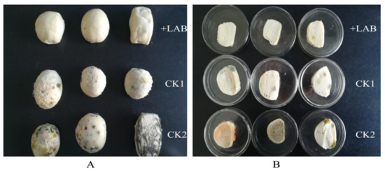 LAB, as probiotics, are generally recognized as safe (GRAS) strains [12]. It is widely known that the acidic substances produced by LAB fermentation reduce the pH value of the environment and cause intracellular acidic stress, resulting in unfavorable conditions for the growth of fungus in food products [13]. These acidic substances, including lactic acid (LA), acetic acid (AA), propionic acid, phenyllactic acid (PLA) and fatty acid, have been proven to have an antifungal ability [14]. In addition to organic acids, some peptides and esters [15] have also been identified as antifungal compounds. LAB are naturally present in many foods and widely used as bio-preservatives because of their antifungal properties. Lan et al. sprayed a certain concentration of LAB fermentation broth on the surfaces of grapes, which could prolong the shelf life of grapes containing Penicillium oxalate for 6 days [16]. Muhialdin et al. reported that the supernatant of the four strains of LAB with antifungal activity that were screened from food could prolong the shelf life of cheese by 19–29 days at 4 °C and 6–12 days at 20–30 °C [17]. Alireza Sadeghi et al. found that the growth of A. niger on produced bread was also remarkably decreased using controlled sourdough (containing the selected LAB isolate) in comparison with spontaneous sourdough and control bread [18]. Chinese steamed buns (CSB) are a food made from wheat flour and water as raw materials and yeast as the main starter, kneaded into dough, fermented, shaped and steamed after awakening. As the traditional staple food in China, CSB occupy an important position in the population’s diet structure. With the acceleration in the pace of the population’s lives, the industrialization of staple foods will definitely become a future development trend, and the industrialization of CSB will be an important part of this [19]. However, because CSB are rich in nutrition and have a high water content, they can be easily corrupted by bacteria and mold during storage, and the shelf life is very short; all these factors restrict the development pace of the industrial production of steamed bread [20]. Therefore, screening and identifying the LAB with a high organic acid yield and strong antifungal ability can provide potential biological control agents for prolonging CSB’s shelf life.