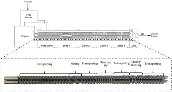 Diagram of the twin-screw extruder, showing the temperature zones and the configuration of the screws (which are shown one above the other, to facilitate visualization).