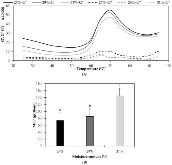 Rheology of the samples that were fed into the extruder, prepared with rice and 27, 29, or 31% water. (A) Storage moduli (G’) are shown in solid lines and Loss moduli (G”) in dotted lines; (B) Melt flow rate (MFR). Different letters show significant differences (p < 0.05). Data are means of three samples ± typical error.
