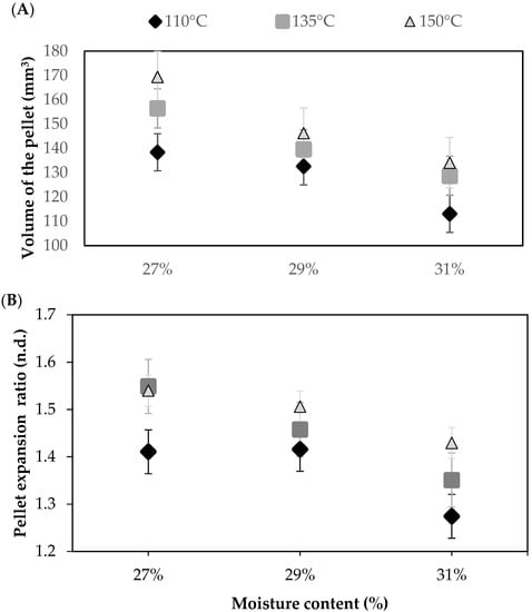 Microstructural characteristics of the pellets produced feeding a rice-flour mix with different moisture levels (27%, 29%, or 31%) and processed using different extrusion temperatures (110 °C, 135 °C, or 150 °C). (A) Volume of the pellet (VP). Results are expressed as mean (n = 3) ± typical error. (B) Expansion ratio of the pellet (ERP). Results are expressed as mean (n = 42) ± typical error.