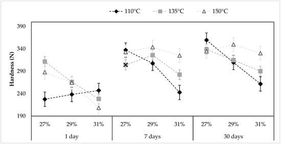Hardness of the pellets produced feeding a rice-flour mix with different moisture levels (27%, 29%, or 31%) and processed using different extrusion temperatures (110 °C, 135 °C, or 150 °C), 1, 7, or 30 days after extrusion. Data show the mean of fifteen samples ± typical error.