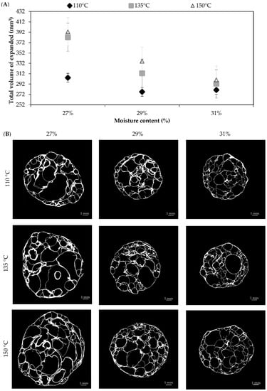 (A) Total volume of the expanded products obtained after microwaving (800 W) pellets for 50 s, which were produced feeding a rice-flour mix with different moisture levels (27%, 29%, or 31%) and processed using different extrusion temperatures (110 °C, 135 °C, or 150 °C). Results are expressed as mean (n = 3) ± typical error. (B) Cross-section X-ray image of the matrix volume of expanded products (MVE). The scale bar represents 1 mm.