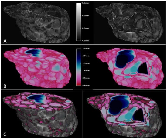 The 3D micro-CT images of the expanded product obtained after microwaving (800 W) for 50 s, pellets that were obtained using an extrusion temperature of 110 °C and feeding rice flour with 27% moisture content, without a virtual cut (left) and with a virtual cut (right). (A) Grayscale 3D volume-rendering image, where the grayscale reflects the structure-thickness distribution of the matrix, representing the wall thickness. (B) Color-coded structure-thickness distribution of the pores ranging from 0 to 2.5 mm, representing the air pores. (C) Overlay of wall thickness and pores.