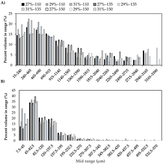 Structure-thickness distribution of (A) pore size and (B) wall size of the expanded products obtained after microwaving (800 W) pellets for 50 s, produced feeding a rice-flour mix with different moisture levels (27%, 29%, or 31%) and processed using different extrusion temperatures (110 °C, 135 °C, or 150 °C).