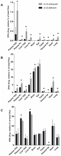 We observed lower DHA levels in the liver, brain, testis, visceral fat, heart, and lung and the lower EPA levels in the liver, eye, testis, visceral fat, heart, and lung of the (n-3)-deficient group as compared to (n-3)-adequate group. This can be explained by the lack of ALA in the diet of (n-3)-deficient group for the EPA and DHA synthesis