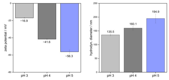 Figure 1 shows the zeta potential values and hydrodynamic diameter of SBP in solution at pH 3, 4, and 5. SBP possessed the most negative zeta potential at pH 5. A high pH value leads to an increased dissociation of carboxyl groups and thus to an increased negative surface charge. Therefore, the dissociation of carboxyl groups and, consequently, the magnitude of zeta potential decreased with decreasing pH. This led to a strongly reduced zeta potential (pH 3: −16.9 ± 0.5 mV) at pH < 3.48, which is the pKa of galacturonic acid [27]. This is in good agreement with Alba et al. [21], who showed a sharp decrease in the charge of okra pectins due to protonation of the carboxyl groups at pH values < 4. Moreover, Zeeb et al. [36] showed that for 0.5% pectin solutions, the lowest zeta potential and thus the highest surface charge occurred at pH 5 (zeta potential of approx. −32 mV). Li et al. [37] measured a zeta potential for 1.0 wt% pectin solutions after filtration through 0.45 µm membranes. In the study, a value of about −40 mV at pH 5 was obtained. However, significantly higher surface charges were obtained in our study (see Figure 1). The lower charges in the study of Zeeb et al. [36] and Li et al. [37] can be attributed to the use of buffer solution and preservatives, in which the positively charged sodium ions shield the negative charges. In addition, differences in the structure of pectins, e.g., different degrees of esterification, lead to different zeta potentials [24].