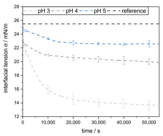 In the pendant drop method, a liquid-liquid interface is considered, but the adsorption of the emulsifier molecules proceeds diffusively from a resting bulk phase. Measuring the decrease in interfacial tension over time can be used to obtain information about the adsorption process of SBP. The dynamic interfacial tension between MCT oil and 0.1 wt% pectin solutions was measured at pH 3, 4, and 5 for 15 h (Figure 2). At lower pH values, the IFT decreased significantly faster and more strongly (pH 3 > pH 4 > pH 5). This is in good agreement with Schmidt et al. [24], where the negative repulsion between interface and pectin molecules slowed down the adsorption kinetics of citrus pectin at pH 4 compared to pH 2.