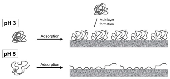 Schematic illustration of sugar beet pectin’s adsorption and conformation at hydrophobic surfaces at pH 3 (compact conformation) and pH 5 (unfolded conformation).