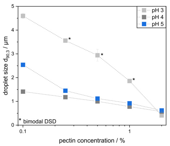 Characteristic droplet size d90,3 of emulsions prepared with 10 wt% MCT oil and varying pectin concentration of 0.1–2.0 wt% at different pH levels (3, 4, and 5). The emulsions were prepared with a high-pressure homogenizer at 400 bar and in a second pass at 800 bar. * Emulsion with bimodal droplet size distribution (DSD).