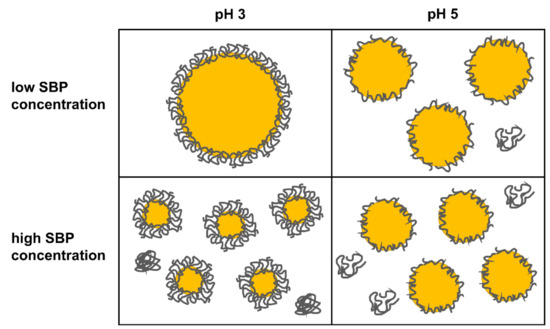 SBP’s conformation at the interface of oil droplets, based on obtained results, is depicted schematically for pH 3 (compact conformation) and pH 5 (unfolded conformation) in Figure 5.