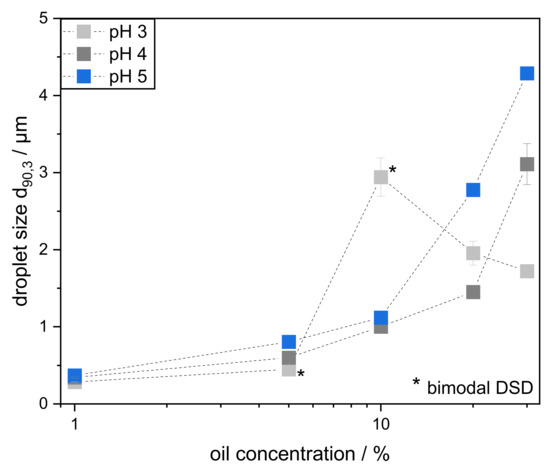 Characteristic droplet size d90,3 of emulsions prepared with 0.5 wt% pectin and varying oil content (1–30 wt%) at different pH levels (3, 4, and 5). The emulsions were prepared with a high-pressure homogenizer at 400 bar and in a second pass at 800 bar. * Emulsion with bimodal droplet size distribution (DSD).