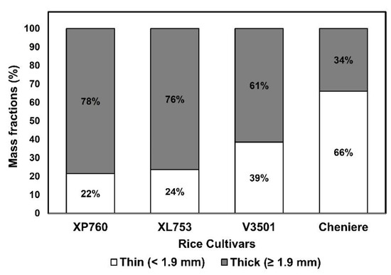 The thickness fraction of rough rice resulted in thick fractions ranging from 34% to 78% of bulk rice on a mass basis (Figure 1). A thick kernel range of the bulk rice can vary as a function of rice cultivar and cutoff levels of thickness grading [20,21,29]. For example, Grigg and Siebenmorgen [21] showed a narrower range of thick kernels (>2.0 mm), with values ranging between 67% and 89% of the bulk rice on a mass basis, after thickness fraction was included in the process stream of four long-grain cultivars (CL 151, CL XL729, CL XL745, and Wells). Matsue et al. [29] similarly reported thick kernels (≥1.9 mm) in a narrower range of 85% to 97% in three short-grain rice cultivars (Koshihikari, Nipponbare, and Hinohikari). In the current study, hybrid cultivars XP760 and XL753 exhibited the lowest percentage of thin kernels, with 22% and 24% of thin mass fractions, respectively, while pureline cultivar V3501 exhibited a thin mass fraction of 39%, nearly two times higher than that of the two hybrid cultivars. For Cheniere, the mass distribution of the thin-kernel fraction was almost three times higher than that of the hybrid cultivars (66%). Such a high proportion of thin kernels found in the purelines Cheniere and V3501 would represent a non-favorable scenario in a realistic setting if thickness fraction were to be applied since the thinner kernels would then have to be removed. Different mass distributions of thickness fractions were previously reported across various hybrid and pureline long-grain rice cultivars. Similar to our findings, Jannasch et al. [30] reported that RoyJ, a pureline cultivar, was comprised of a greater proportion of thinner kernels (<1.88 mm), while XL756, a hybrid cultivar, exhibited a greater proportion of thicker kernels (>1.88 mm) after thickness fraction was applied. These results suggest that variations in kernel thickness among cultivars should be taken into consideration when thickness fraction is included in the rice processing stream. Moreover, since environmental conditions such as soil composition and fertilization management may have an even greater impact on kernel thickness distribution than the cultivar effect [22], cultivation conditions within rice cultivars should also be considered even though genetic differences among cultivars can explain some kernel thickness variation distribution.
