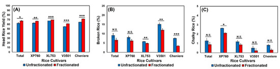 The effects of thickness fraction on (A) head rice yield, (B) broken rice percentage, and (C) chalky rice percentage for each rice cultivar. Error bars represent standard errors of the means. N.S. represents no significant difference (p > 0.05). *, **, and *** represent a significant difference at p < 0.05, p < 0.01, and p < 0.001, respectively.