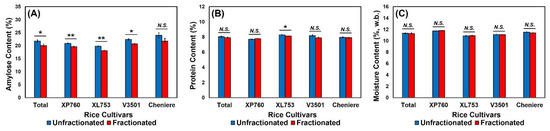 Similar to its behavior with respect to amylose content, fractionated rice also exhibited lower protein content than unfractionated rice in cultivar XL753 (t = 3.97, p = 0.02), while such differences were not observed in other cultivars: XP760 (p = 0.17), V3501 (p = 0.11), and Cheniere (p = 0.65) (Figure 3B). Matthews et al. [43] found that, after size fraction, thinner kernels exhibited higher protein content than thicker kernels. Siebenmorgen et al. [2] also observed a positive correlation between protein content and immature thin rice kernels [2,44]. Even though rice is one of the cereals with the lowest protein content, the net protein utilization of rice is the highest among the cereal grains [45], so the higher amount of protein in unfractionated rice would also pose an advantage from a nutritional standpoint. For moisture contents, no significant effects of thickness fraction were observed in the four rice cultivars: XP760 (p = 0.56), XL753 (p = 0.73), V3501 (p = 0.23), and Cheniere (p = 0.12), as shown in Figure 3C.