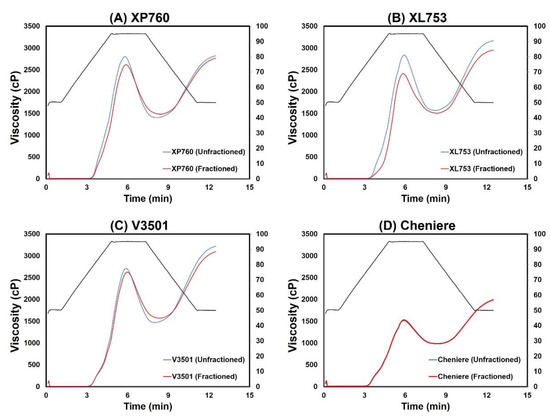 Figure 4 depicts the RVA pasting profiles of both unfractionated and thickness-fractionated portions of the four long-grain cultivars evaluated. Generally speaking, when visually inspecting pasting profiles, it can be seen that thickness-fractionated rice exhibits a lower viscosity profile than unfractionated rice for all of the long-grain rice cultivars, although the effect for Cheniere was less pronounced. The effects of thickness fraction on various viscosity parameters were found to vary with rice cultivars (Table 2). Hybrids XP760 and XL753 exhibited a significant reduction by approximately 6% and 15%, respectively, in their peak viscosities when thickness fractionating was applied. Wadsworth et al. [32] also reported higher peak viscosities in unfractionated rice compared to thickness-graded rice of a long-grain rice variety (Starbonnet), indicating that the effects of the various fractions on peak viscosity are additive. However, peak viscosities of purelines Cheniere and V3501 seemed to be unaffected by the thickness fraction process (p > 0.05), possibly because the pureline cultivars had a significantly larger mass distribution of thinner kernels in the unfractionated portion compared to that in the hybrid cultivars. Interactions between thickness fraction and rice cultivar were also observed with respect to final viscosity and setback (Table 2). For cultivars XL753 and V3501, the final viscosities showed a significant decrease after thickness fractioning, while an opposite trend was seen for the pureline Cheniere, where the final viscosity was significantly higher in the fractionated portion compared to the unfractionated portion of the same cultivar. These results suggest that genotypic variance in final viscosities and setbacks must be considered when a thickness fraction process is included, and selection of a cultivar for further size fraction should be performed on the basis of the functional properties and end applications of the rice.