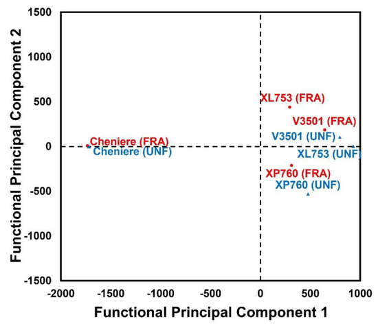 A biplot of the functional principal component analysis (FPCA) based on the rapid visco analyzer (RVA) pasting profiles of unfractionated (UNF) and fractionated (FRA) samples of the four rice cultivars: XP760, XL753, V3501, and Cheniere. The first two functional principal components (FPC) accounted for 99.04% of the total variances, with FPC 1 and FPC 2 explaining 92.70% and 6.34%, respectively.