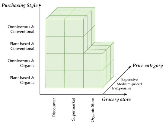 Pictorial representation of the 30 different shopping baskets. The three grocery stores are plotted on the x-axis. In each grocery store, an inexpensive, medium-priced, and expensive product was selected, which is plotted on the z-axis. On the y-axis, the four purchasing styles—omnivorous and conventional, omnivorous and organic, plant-based and conventional, and lastly, plant-based and organic. The organic store does not carry conventional products, so there are no corresponding shopping baskets for this intersection.