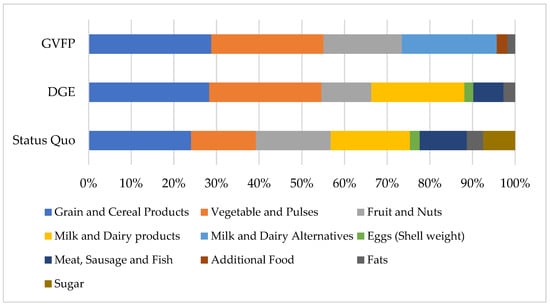 The proportion of milk and dairy products or their alternatives are rather comparable within the three diets, with 18.6% (status quo), 21.8% (DGE), and 22.2% (GVFP). The consumption of primary animal-based products, such as meat (products) and fish, is much higher than recommended with 0.705 kg more than described as the maximum intake by the DGE. The consumption of eggs and fats in Germany is currently also higher than recommended by both nutrition guidelines. In addition, sugar is consumed as 7% of the overall average diet, whereas it is completely excluded in both dietary recommendations.