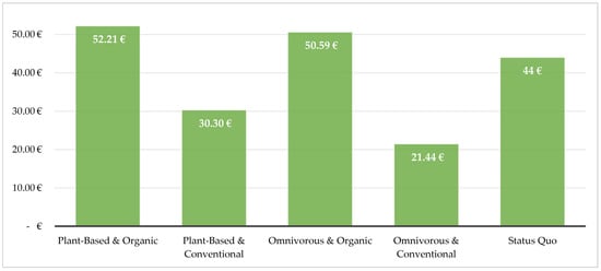 This transitions well to the third part of this study: assessing the economic factor along its influence on food choices. The fact that the price of food has a strong influence on food choices is consistent with a qualitative study in the UK by Puddephatt et al. []. Our results indicate that the generally higher costs of plant-based and organic products seem to be an important reason for the rather unhealthy, environmentally unfriendly status quo and why an omnivorous, conventional shopping basket is preferred by the average German customer. Because organic products cost, on average, twice as much as conventionally produced ones, and a plant-based diet on average is 15% more expensive than an omnivorous diet, it is clear that there is no financial incentive given for buying more sustainably. Further, if one chooses to follow an omnivorous diet, an economic incentive is not set regarding organically produced meat: they are faced with more than double the cost of current meat expenditure, when following the DGE recommendation, which even suggests lower meat consumption than the status quo, and purchasing organic meat. Hence, one must be able to afford a sustainable purchase. On average, Germans spend 14% of their income on food, beverages, and tobacco []. The absolute spendable sum can be restrictive for people with lower incomes. Thus, factoring in sustainability when purchasing food is likely to be a luxury decision.