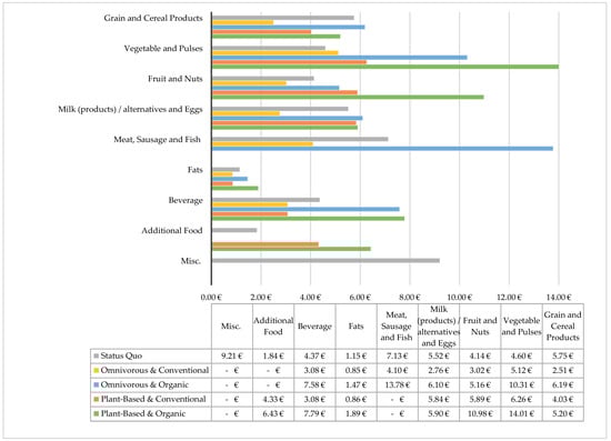 To work out the differences between the purchasing decisions in more detail, a look is taken at the food groups and cultivation forms within the different dietary styles, as well as the current average expenses of German consumers (Table 2 and Figure 5).