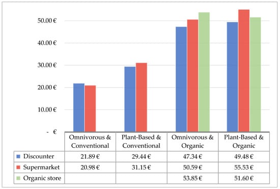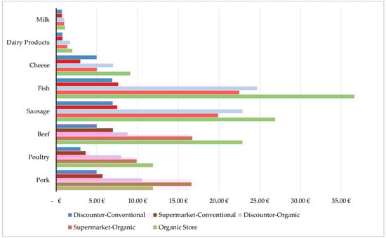In this section, the results of the market research are analyzed as they are compared with the current average expenditure for food in Germany. The average expenditure of a German consumer is largely similar to the prices of the cheapest examined price level []. Therefore, only this price group is considered in detail below. The results of the remaining price levels can be found in the Supplementary Materials.