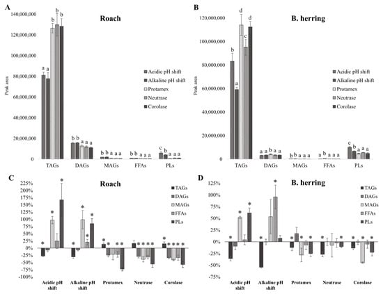 Sum peak areas of triacylglycerols (TAGs), diacylglycerols (DAGs), monoacylglycerols (MAGs), free fatty acids (FFAs), and phospholipids (PLs) in protein isolates and hydrolysates of roach (A) and B. herring (B), and relative changes in lipid class peak areas in lipids of protein isolates and hydrolysates compared with the fish raw material (C,D). Different letters or an asterisk (*) within each lipid class indicate a statistically significant difference (p < 0.05). Peak areas in an equal content of lipids were determined using liquid chromatography mass spectrometry.