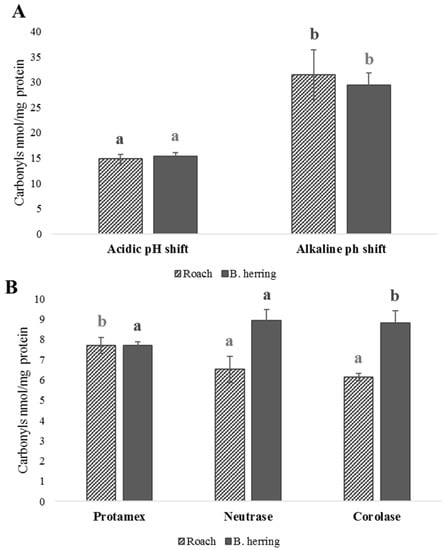 Protein carbonyls (nmol/mg protein) in protein isolates produced using pH shift (A), quantified using the original carbonyl method [40], and in enzymatically produced hydrolysates (B), analyzed using a modified method by Mesquita et al. [41]. Different letters within the same raw material indicate a statistically significant difference (p < 0.05).
