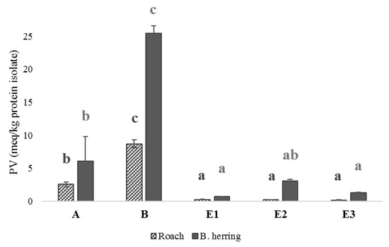Peroxide values (meq/kg protein isolate) in protein isolates produced using acidic or alkaline pH shift and hydrolysates produced using Protamex, Neutrase, or Corolase. Different letters within the same raw material (roach or B. herring) indicate a statistically significant difference (p < 0.05).